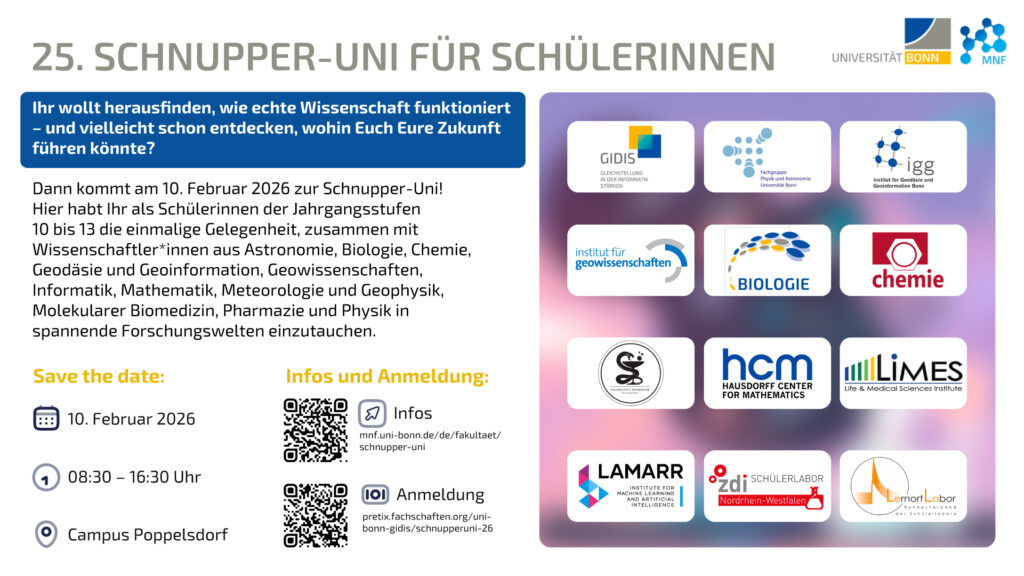 Am 10. Februar 2026 haben Schülerinnen der Jahrgangsstufen 10 bis 13 die besondere Gelegenheit, einen Tag lang in die Welt der Forschung an der Universität Bonn einzutauchen. Bei der 25. Schnupper-Uni für Schülerinnen öffnen zahlreiche Institute und Fachbereiche aus Astronomie, Biologie, Chemie, Geodäsie & Geoinformation, Geowissenschaften, Informatik, Mathematik, Meteorologie & Geophysik, Molekularer Biomedizin, Pharmazie und Physik ihre Türen.