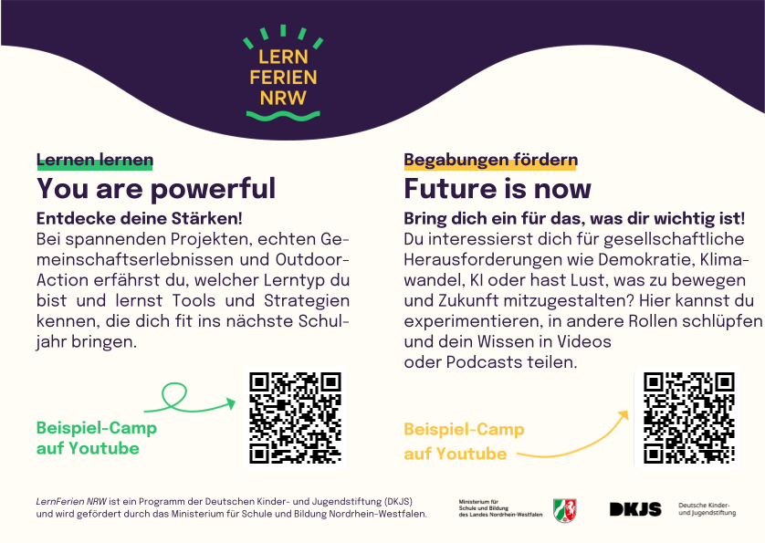 Alle Infos zu den Camps und die Anmeldemaske findest Du unter: https://www.lernferien-nrw.de