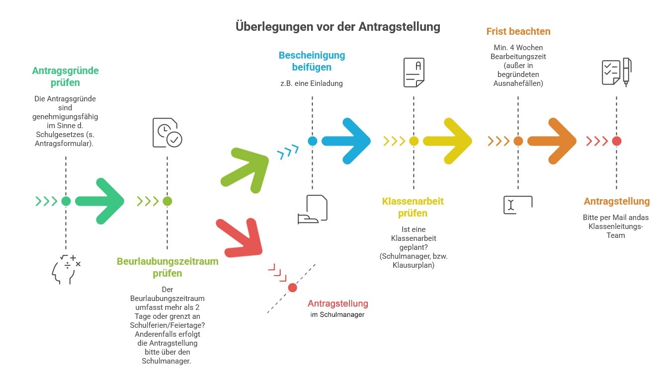 Vor der Antragstellung sollte geprüft werden, ob ein genehmigungsfähiger Grund im Sinne des Schulgesetzes vorliegt. Auch der Zeitraum ist zu beachten, insbesondere im Hinblick auf Ferienzeiten.